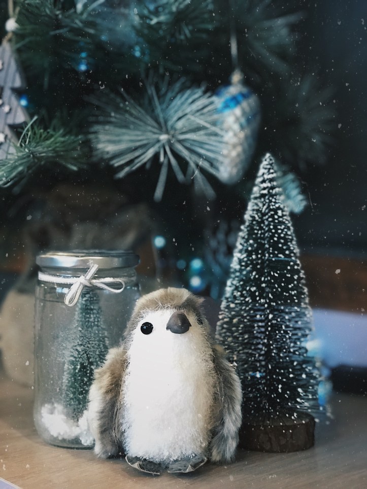 As for the ornaments, they’re quite different despite being in the same color scheme. Most of them are my old ones, which add nostalgia to the tree. I have some diy ones, wooden ones, and ofc the little Nutcracker in a blue suit. The winter wonderland doesn’t end with tree though, it goes all over to my desk, where I’ve got my little friend Peggy the Penguin hanging around with his sleighs, with some little christmas trees, full of snow of course, and a snowy card, to finish the ensemble.