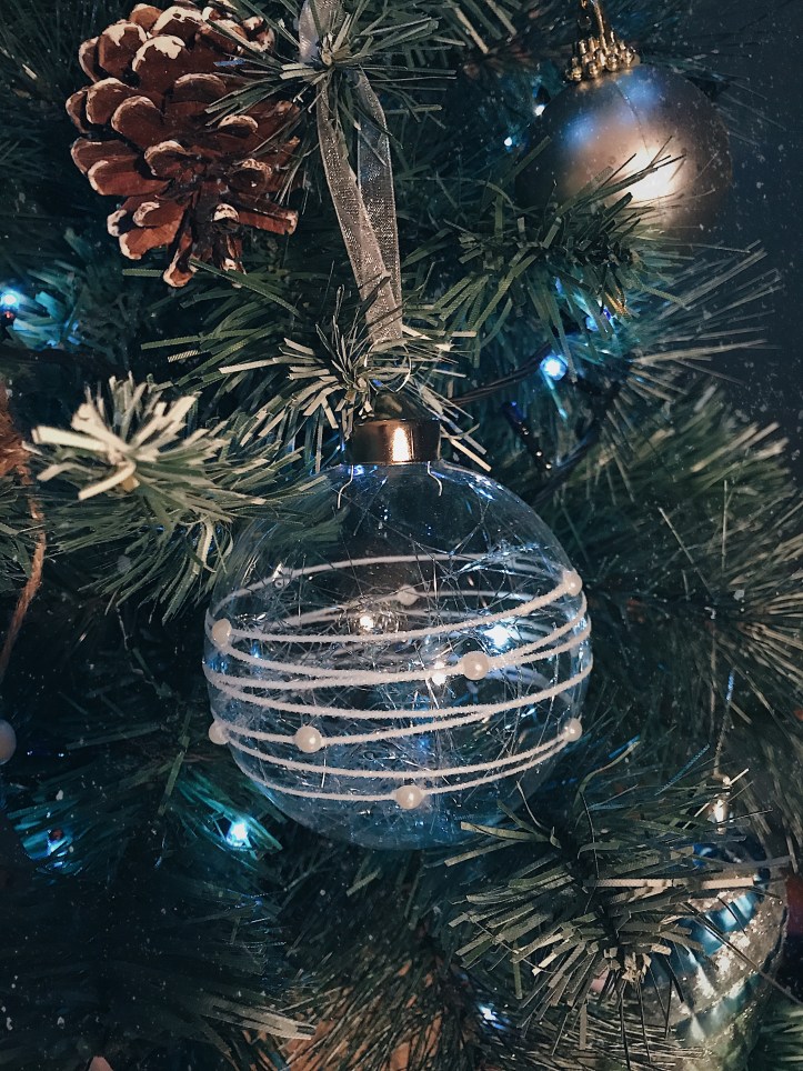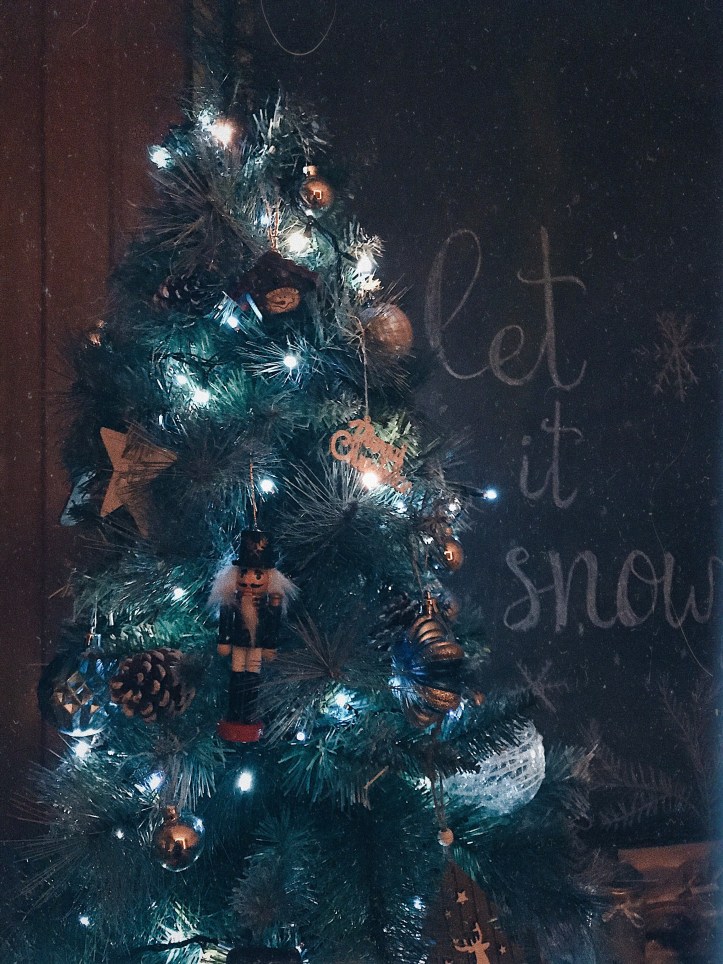 I really adore my blue lights, they’re just pure magic, twinkling in-between the branches, it’s like moonlight shining on the snow, which is one of the most fascinating things in reality. Also the lights get reflected on the glass and silver ornaments, which makes it even more magical. And the shadows of the branches fall all over the desk and the background, which really beautiful. And it just keeps you in the world of dreams, looking at those tiny lights in darkness, and dreaming about everything, well in my case, magic.