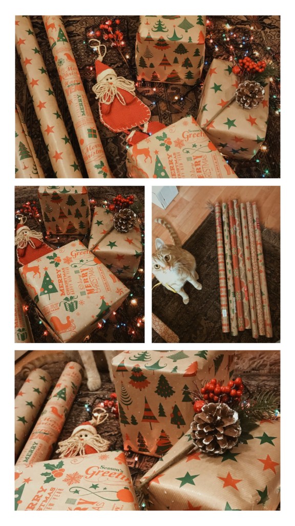 Sorry about this flow of philosophical monologue, haven’t done that in a while. This year I ordered all my gifts way too early, so there were only a couple of things to buy, and this week I was done with those too. And of course the wrapping, something that I like, but can’t do professionally. I kind of learned how to do the classic square ones, like books or boxes, as for everything else, that’s a challenge for me. Every year I find these vintage wrapping paper and they look so great, even with my poor wrapping skills.