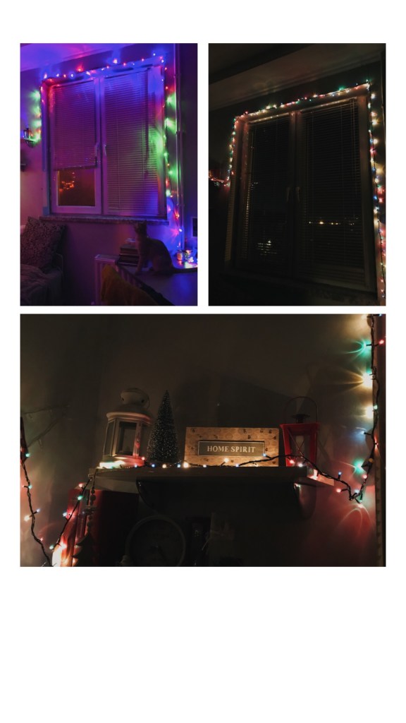 Every year I put colorful twinkle lights around my window, and it has always been my most favorite part of the whole house, as I got to look at them every night before going to bed. This year my lights were brutally destroyed by Sammy, so I had to find a substitute for them. And once again I got convinced, that old things are better than new ones. My old lights were really warm and cozy, they truly conveyed the Christmas spirit. The ones I found now (at first) were bright, eye-aching, neon colors, and my room looked like a club, and not a good one. Luckily I found some good ones in an old, antique shop, and now I feel completely festive, wearing pajamas, watching vlogmases or christmas films and enjoying my twinkling lights.