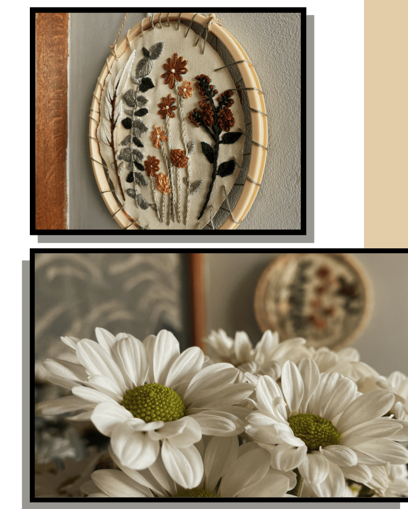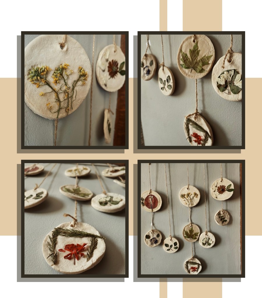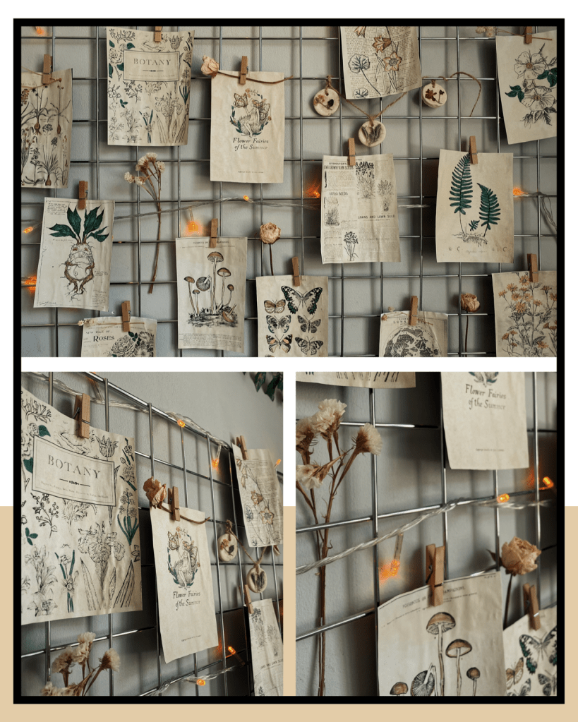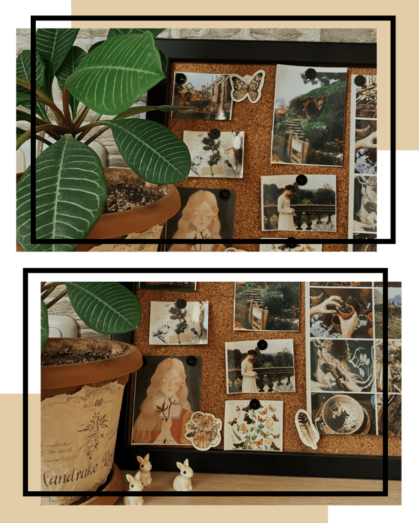 Now for decor. This isn’t necessary, but for me personally, making your own decor adds up so much soul to the room. Again, maybe it’s because in older times people would make something rather than buying, that’s why diy-s are best friends of cottagecore vibes, at least for me. This year I made three things: the vintage looking cards (which are just free printables, that I soaked with coffee and added some accent colors with markers), salt dough with pressed flowers, and the embroidery that didn’t turn out as good as I wanted to, but still looks nice. Also I think this kind of simple hobbies go well with the cottagecore aesthetic. So whether it’s a herbarium, embroidery, fancywork, drying or pressing flowers, find what you like the best and it can be the best activity and decor at the same time. Oh, and I nearly forgot the mood-board, which is the best thing for getting inspired. You can pin photos you’ll find online, scenes from movies and cartoons, different illustrations or even stickers, and it will be the precious source of inspiration.