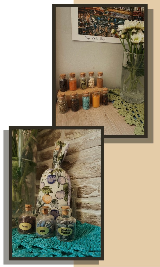 When I imagine life in a cottage, there are always some witchy or wicca vibes. Not the hexing and jinxing stuff, with skulls, bones, blood etc. In older times people payed more attention to their surroundings, knew much more about nature, and how to use their powers and energy for healing or doing something good. That’s why you’d often see dried herbs hanging from the walls, crystals and stones, shells, different spices add up together, even some “potions“, meaning liquid ingredients kept in bottles. Those witchy vibes always inspired me, I loved all the elements of nature, each having their special purposes, little bottles or jars with corks, which look so amazing, even if you keep salt and pepper in them, or bags with aromatic herbs… These are really small and “inessential” things that will give more definition to your general atmosphere and will make it more cozy and interesting. As well as having other, healing purposes.