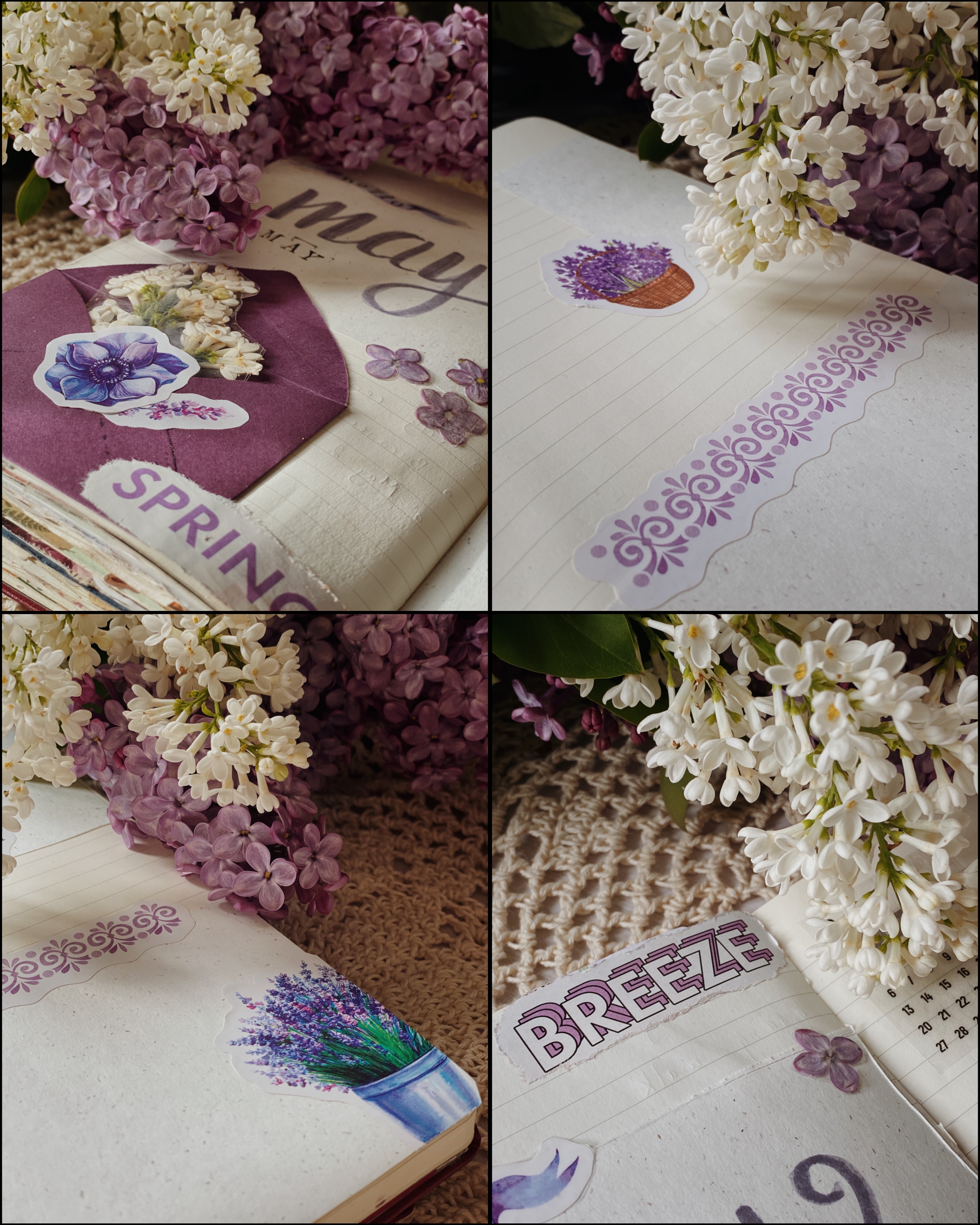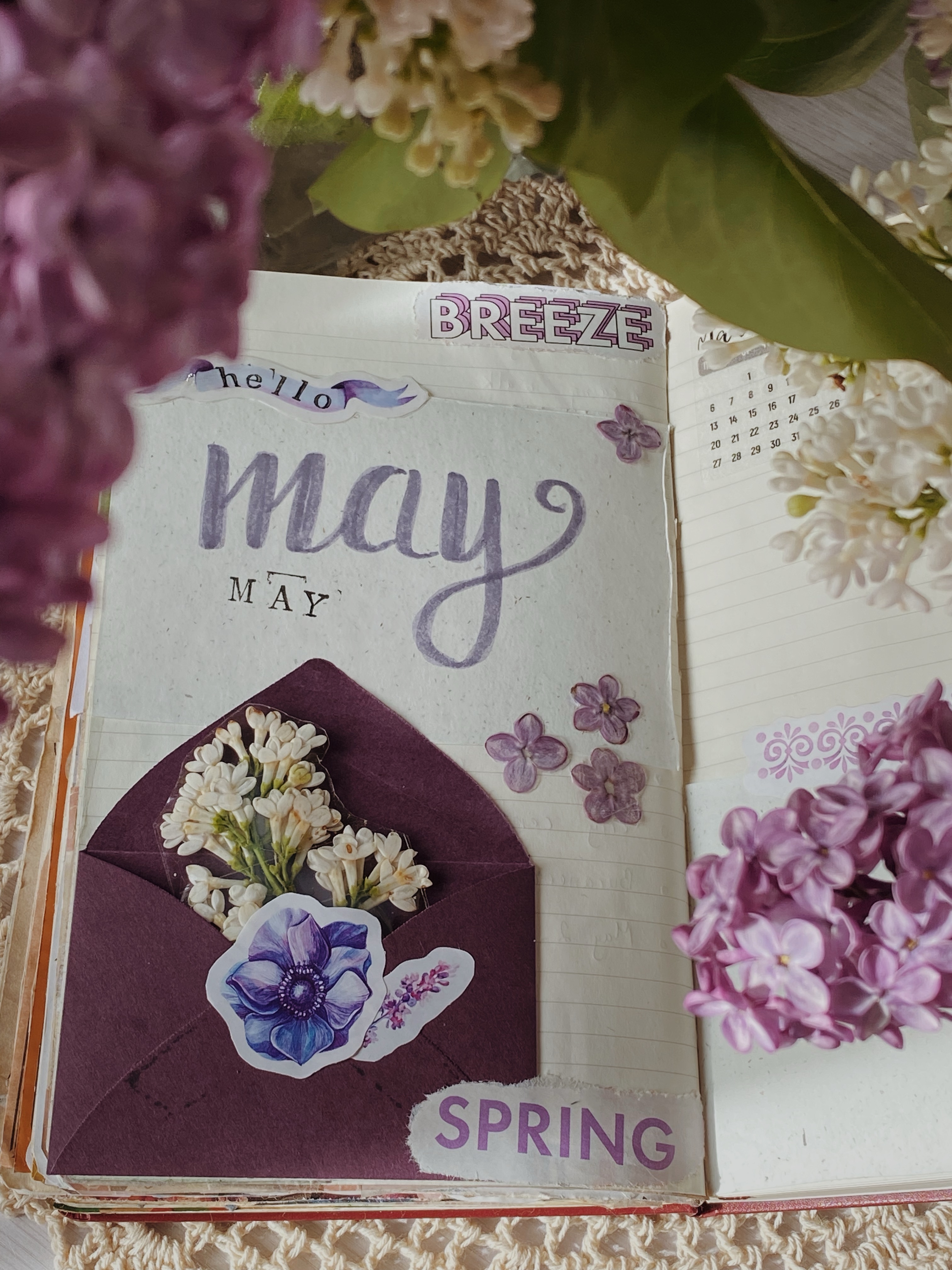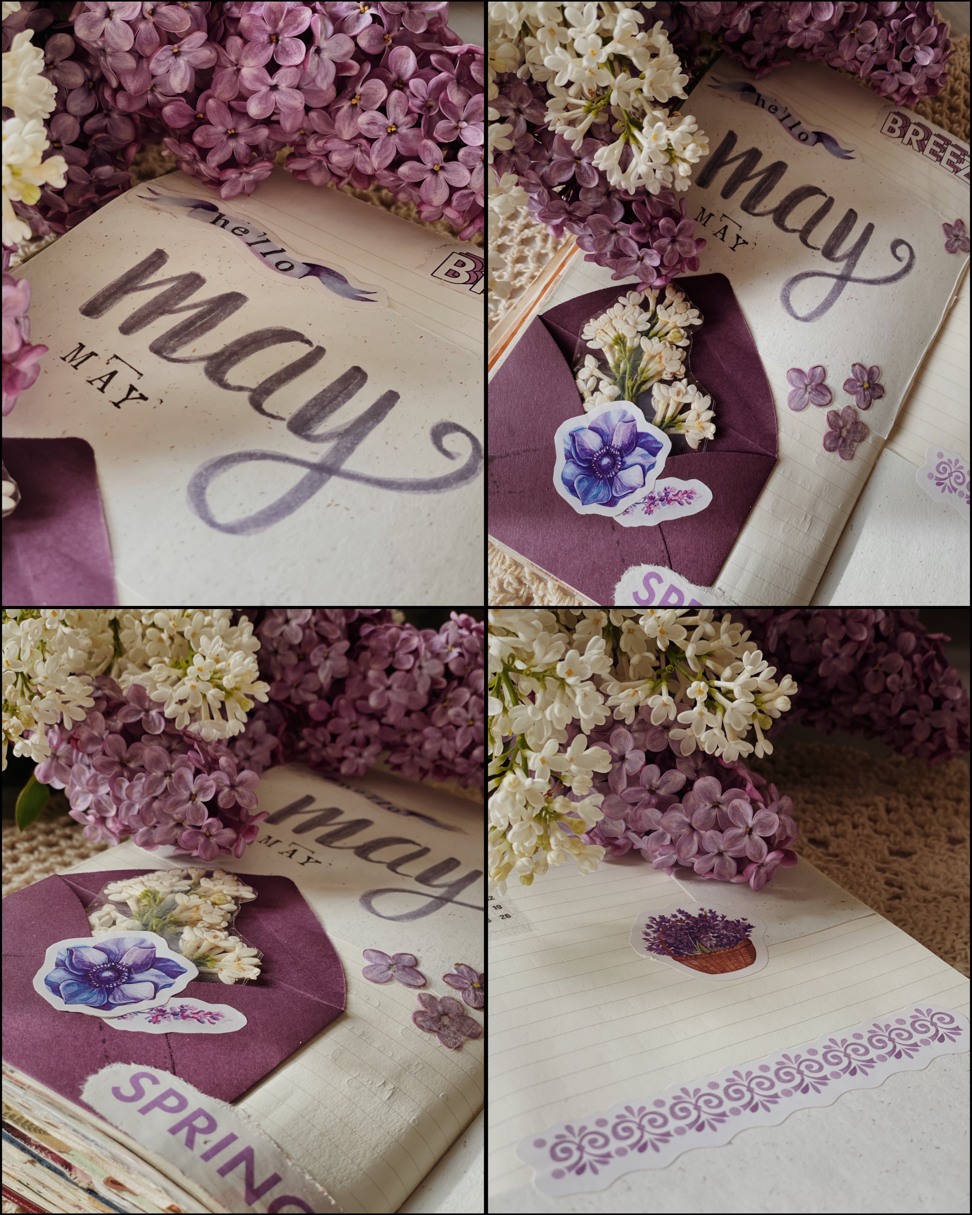 I loved the idea of having a little letter in the corner, with some white lilacs coming out of it, like it opens a portal to this month. I really hope that the white flowers won’t turn brown, so I didn’t glue them to the letter, just in case.